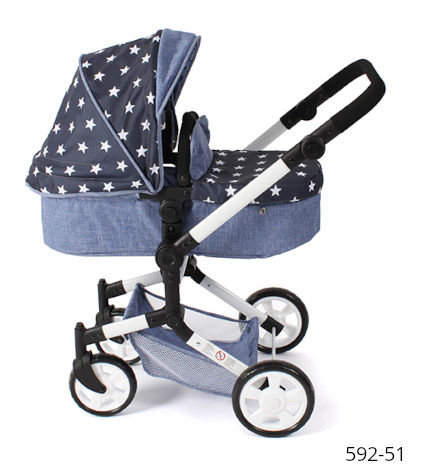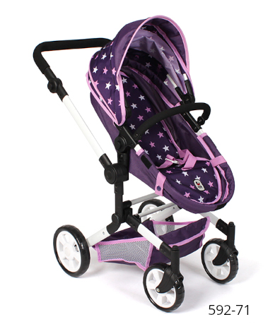 Der Kombi-Puppenwagen ist mit vielen praktischen Funktionen und einem stabilem Gestell ausgestattet. Der Schiebegriff ist höhenverstellbar und passt sich so der Körpergröße des Kindes an. Durch einfache Handgriffe kann der Puppenwagen in einen Sportwagen umgebaut werden. Dieser ist mit einem 3-Punkt-Sicherheitsgurt ausgestattet. Der Schieber lässt sich schwenken, so dass der Puppen- bzw. Sportwagen von beiden Seiten aus geschoben werden kann. Durch die schwenkbaren Vorderräder ist der Wagen besonders wendig. Im Set gibt es einen Autositz im gleichen Design, der auf das Schiebegestell aufgesteckt werden kann.
