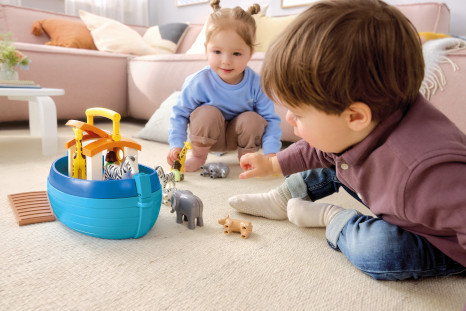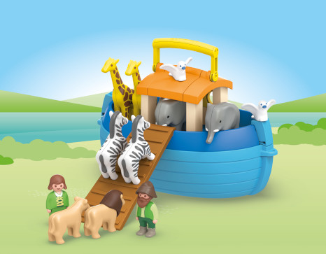 Die Arche Noah besteht aus einem zweiteiligen Schiff mit aufklappbarem Dach, Steg und 5 Tierpaaren: Elefanten, Zebras, Giraffen, Vögel und Löwe und Löwin, sowie Noah mit Frau. Alle Figuren haben auf dem Deck des Schiffes Platz. Zum Mitnehmen des Spielsets passen alle Teile incl. des Stegs in den Rumpf. Auch Kinder, die die Geschichte von der Arche Noah nicht kennen, können mit dem Spielset eigene Geschichten und Rollenspiele erfinden.