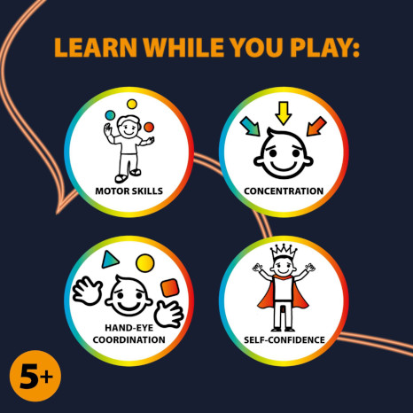 Die drei Bälle haben unterschiedliche Oberflächenstrukturen und führen zu verschiedenen Sprungverhalten und Sprunghöhen. Die unterschiedlichen, griffigen Oberflächen der Bälle sorgen für abwechslungsreiche Sprungmuster. Ein gutes Training für Körper und Gehirn und der Hand-Auge-Koordination nicht nur für kleine Kinder.