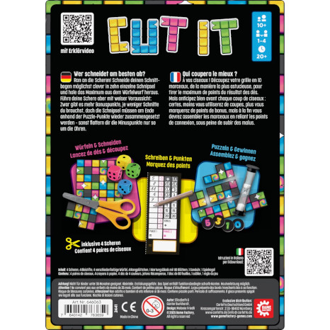 Die Spielenden erhalten ein Blatt vom Spielblock mit 10x10 farbigen Kästchen in 4 Wertungsfarben und schwarzen Kästchen (keine Wertung). Zwischen manchen Kästchen sind Sterne. Es wird mit 4 Farbwürfeln (Farben entsprechen denen auf dem Wertungsblock) gewürfelt. Nun soll jeder Spieler von seinem Blatt mit max 2 Schnitten mit der Schere etwas abschneiden. Ziel dabei ist möglichst viele Punkte zu machen durch Übereinstimmungen der abgeschnittenen Farbflächen und des Würfelergebnisses. Außerdem sollen die Sterne auseinandergeschnitten werden.Wichtig ist, dass das ganze Blatt für 9 x Abschneiden reichen muss. Nach 9x Würfel und Schneiden soll das entstandene "Puzzle" wiederzusammengesetzt werden. Dabei müssen die Sterne wieder passend zusammengefügt werden. Funktioniert gut alleine.
