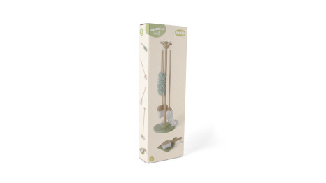 6 Teile. FSC-Zertifiziertes Holz. Ständer H 77 cm. Besen H 61,5 cm, Wischmop H 52 cm. Staubwedel L 35 cm. Kehrschaufel + Kehrbesen L 21 cm.