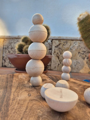 Dieses Set besteht aus Kugeln und Halbkugeln, welche mit viel Geschick und Durchhaltevermögen ganz frei übereinander als hoher Turm oder nebeneinander gebaut werden können. Dabei wird die Konzentrations gefördert und durch das freie Spiel können Kinder eigene Ideen entwickeln.