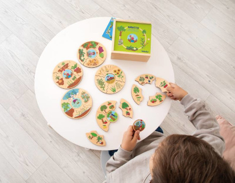 30 Puzzleteile (6 Aufgaben), Birkensperrholz, Ø 12 cm. In Holzkiste mit Schiebedeckel 15*15*6 cm, lackiert, Booklet.