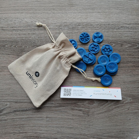 24 Spielsteine bestehend aus 80 Prozent Holzresten, blau gefärbt, Maße der Steine: 6,2*4,3*2,6 cm.