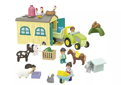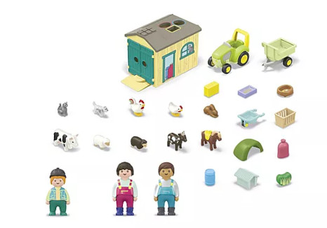 25 Teile: Kunststoff 90% Pflanzenbasiert. Scheune mit Sortierplatte: ca. 20,5*12*14 cm, Traktor mit Hänger: ca. 21*7,2*8,5 cm, 3 Figuren, 10 Tiere, 10 Zubehöre.