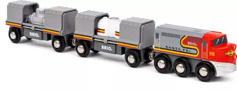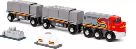 Der Santa-Fe Zug stellt einen der größten Züge Amerikas dar. Das Set besteht aus einer Lok, 2 Güterwagons mit Schiebetüren und Frachtstücken. Eine Bauanleitung benötigen Kinder nicht, die Funktionen sind selbsterklärend. Auch eine Streckenführung der Bahnanlage gestalten Kinder nach eigenen Vorstellungen und benötigen dafür keinen Aufbauplan. Das Zubehör ist kompatibel mit allen Produkten der BRIO World.