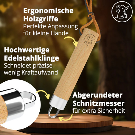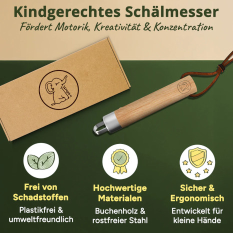 Kinder können mit dem Schälmesser erste Erfahrungen beim Schnitzen sammeln. Das Messer besitzt eine abgerundete und rostfreie Klinge, die das Verletzungsrisiko minimiert. Der Buchenholzgriff liegt gut in der Hand und ist ideal für Kinderhände (geeignet für Links- und Rechtshänder). Es ist vielseitig einsetzbar: Bastelarbeiten, Holzarbeiten und Obst können damit bearbeitet werden. Sicherheitshinweis: Kinder sollten das Schnitzmesser (Schälmesser) unter Anleitung und Aufsicht von Erwachsenen und gebunden an feste Regeln verwenden.