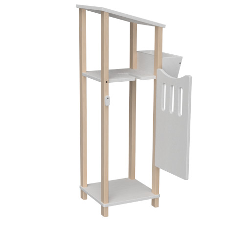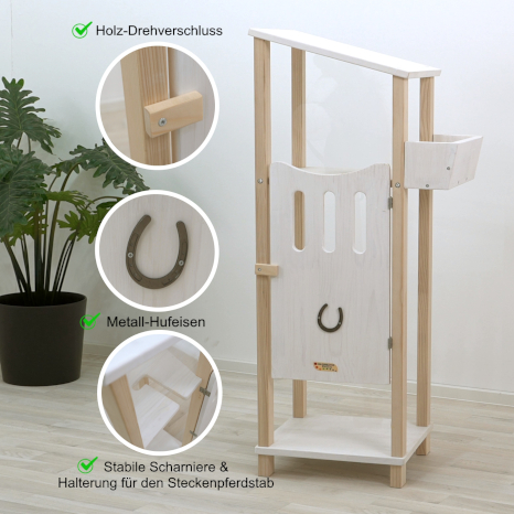 Der Hobby Horse Stall-Schrank dient als Aufbewahrung für Zubehör wie Bürsten oder Zaumzeug. Seitlich kann Futter für die Tiere oder weiteres Zubehör verstaut werden. Das Material kann sowohl im Innenraum als auch Outdoor verwendet werden, da es wetterbeständig ist. Im Stall ist Platz für ein Steckenpferd. Der Stall bietet weitere Spielmöglichkeiten für pferdebegeisterte Kinder.