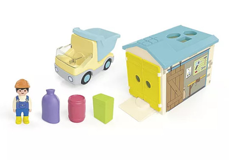 6 Teile, Kunststoff: 1 Garage mit Sortierplatte: ca. 20,5*12*14 cm, 1 LKW mit Anhängerkupplung: ca. 14*7*9 cm, 3 Zubehörteile, 1 Figur.