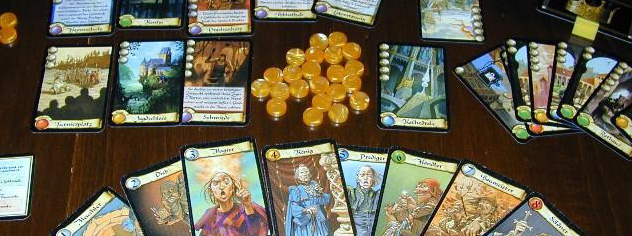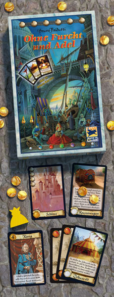 8 Charakterkarten, 65 Bauwerkkarten, 30 Goldstücke, 7 Übersichtskarten.