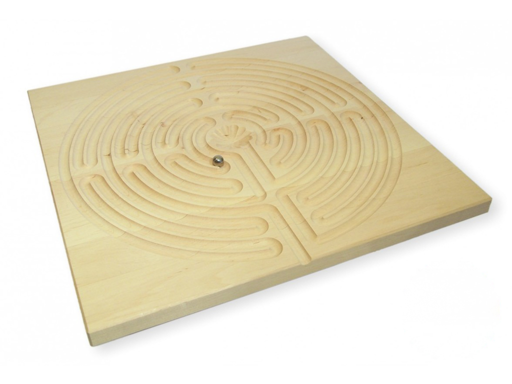 Die eingefrästen Rillen dieses Geschicklichkeitsspieles zeigen das Muster des Bodenlabyrinthes der Kathedrale von Chartres.