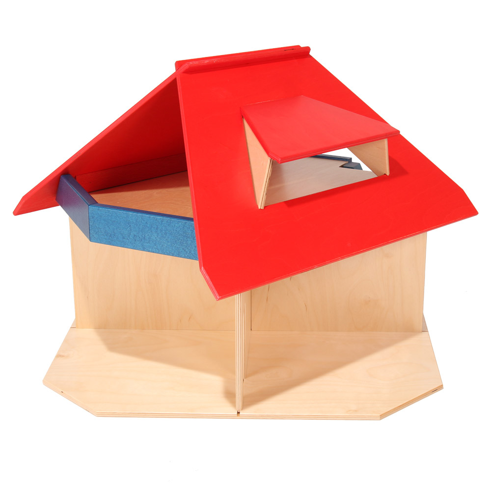 Birkensperrholz natur, lackiert. Dach rot, Treppe und Balkon blau gebeizt. 60*60*46 cm.