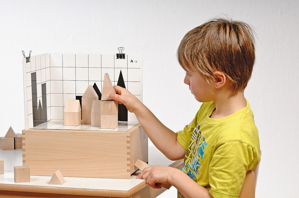 Zusätzlich zu Bauklötzen in 5 versch. Formen (Kantenlänge 4 cm) befinden sich im Holzkasten 20 Schattenvorlagen (nach Schwierigkeitsgrad geordnet). Nach den Abbildungen der Schatten von Bauwerken können diese nachgebaut werden. Die Vorlagen sind in Originalgröße, so dass Kinder ihr Bauwerk selbst überprüfen können. Es kann aber auch frei gebaut werden. Für Institutionen.