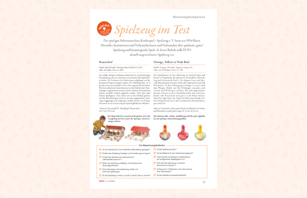TOYS Beratungskompetenz. In dieser Rubrik stellen wir regelmäßig unser aktuell spiel gut ausgezeichnetes Spielzeug vor. In der Ausgabe 11-12/2025 haben wir uns für einen