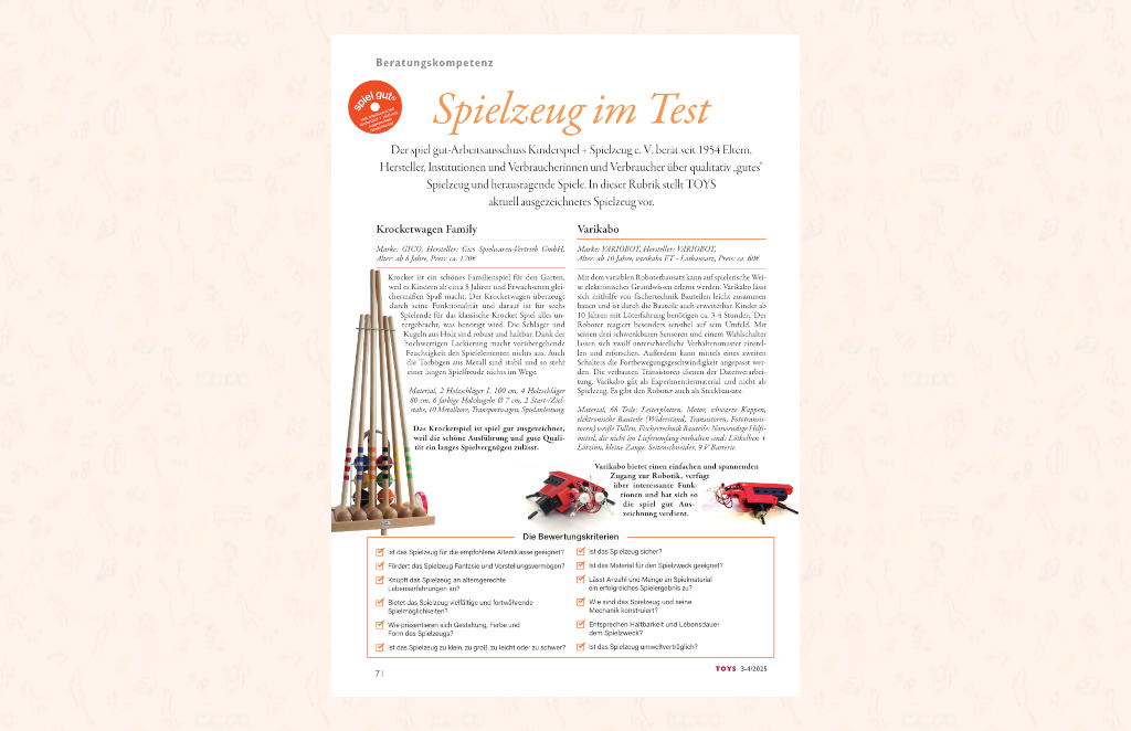 10. Mai 20254. März 2026TOYS Spielzeug im Test 3-4/2025Berichte TOYS Beratungskompetenz. In dieser Rubrik stellen wir regelmäßig unser aktuell spiel gut ausgezeichnetes Spielzeug vor. In der Ausgabe 3-4/2025 haben wir uns für den Krocketwagen Family ab 8 Jahre und den Varikabo ab 10 Jahre entschieden. Zum Artikel